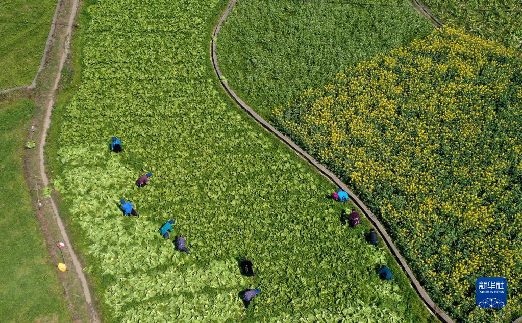 3月8日,村民在貴州省丹寨縣揚(yáng)武鎮(zhèn)密告村采收芥菜(無人機(jī)照片)。