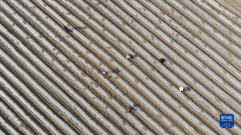 3月8日,河北省邢臺市南和區(qū)河郭鎮(zhèn)辛莊村農(nóng)民在田間勞作(無人機照片)。