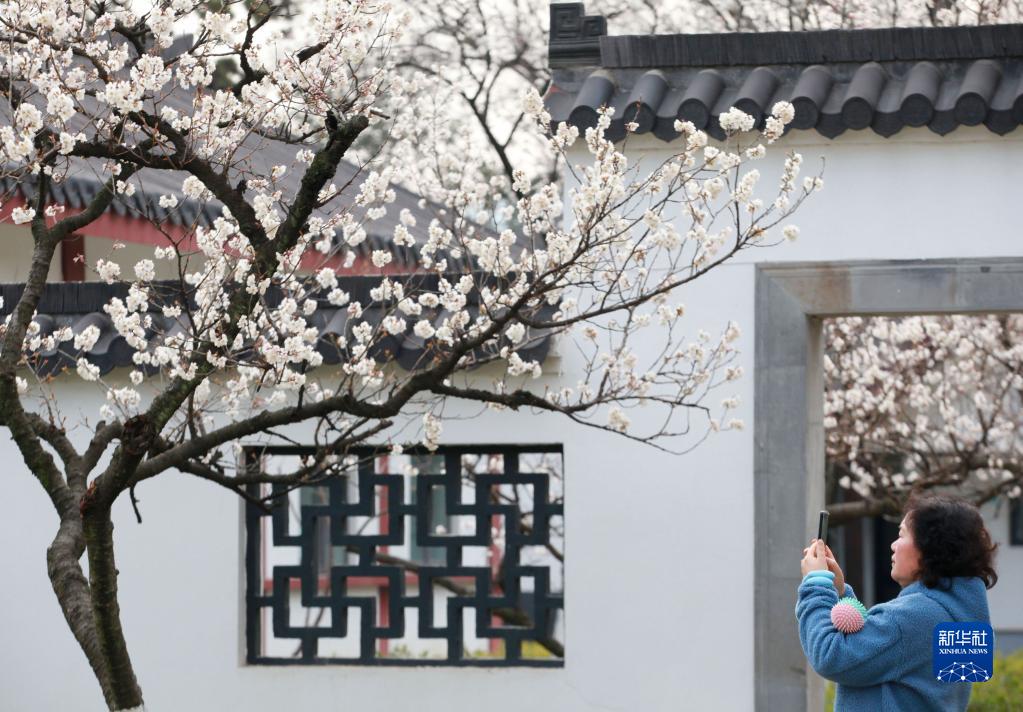 3月7日,游客在江蘇南京玄武湖櫻桃園拍攝盛開(kāi)的櫻桃花。
