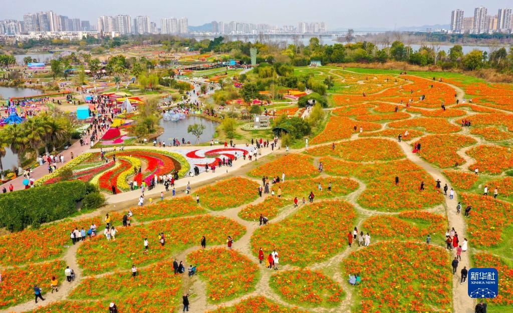 3月6日,四川省遂寧市圣蓮花開(kāi)景區(qū)的鮮花開(kāi)放,吸引游客前來(lái)踏青賞花(無(wú)人機(jī)照片)。