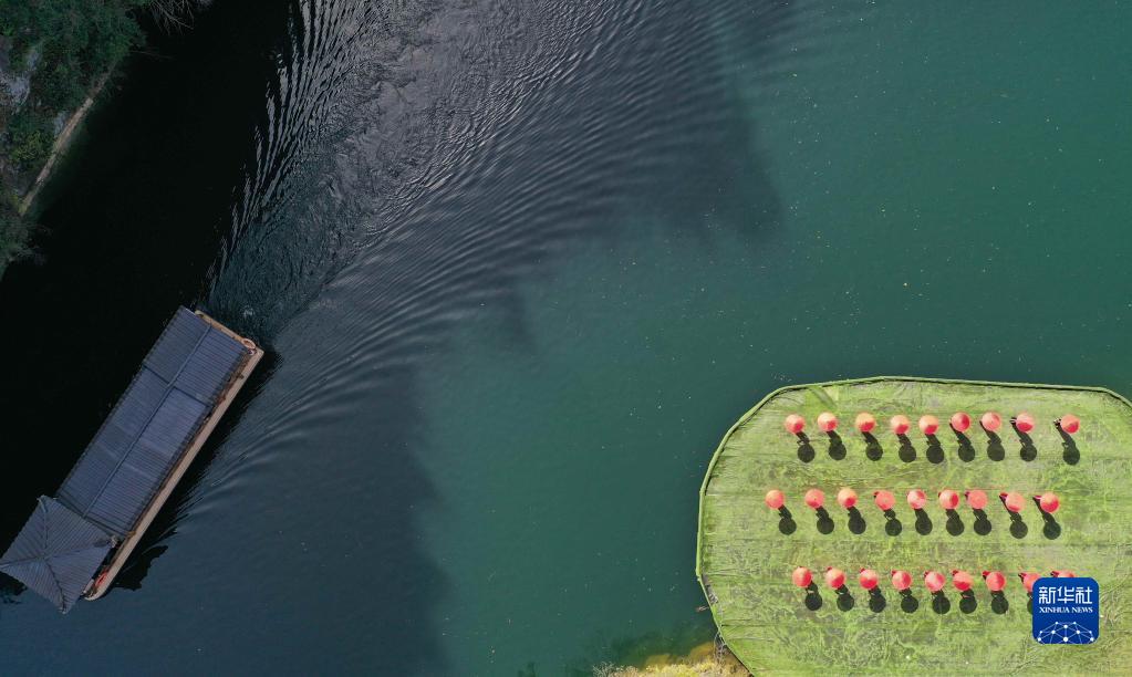 3月7日,游船行駛在張家界市武陵源區(qū)寶峰湖景區(qū)水面上(無人機照片)。
