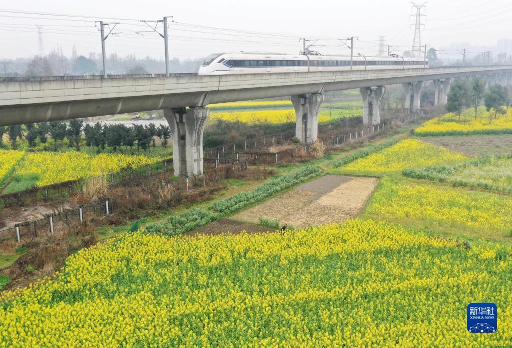 3月6日,動(dòng)車組列車從四川省彭州市連封村油菜花田旁駛過(無人機(jī)照片)。