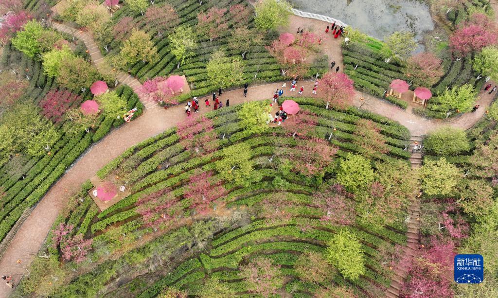 3月5日,游客在湖南省郴州市蘇仙區(qū)高椅嶺茶園踏青賞花(無人機照片)。