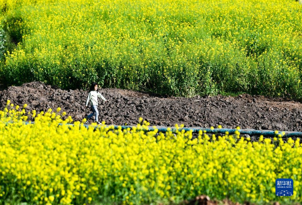 3月7日,小朋友在貴州省盤州市保田鎮(zhèn)甘河村的油菜花田邊游玩。