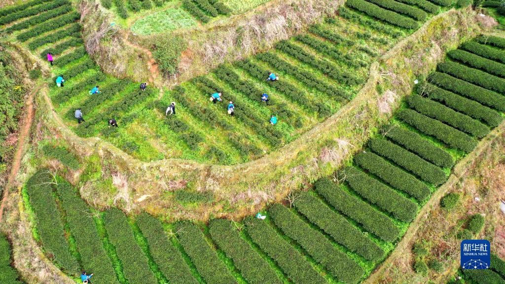 3月7日,采茶工人在貴州省榕江縣忠誠(chéng)鎮(zhèn)忠誠(chéng)社區(qū)大田榜生態(tài)茶園采摘茶葉(無(wú)人機(jī)照片)。