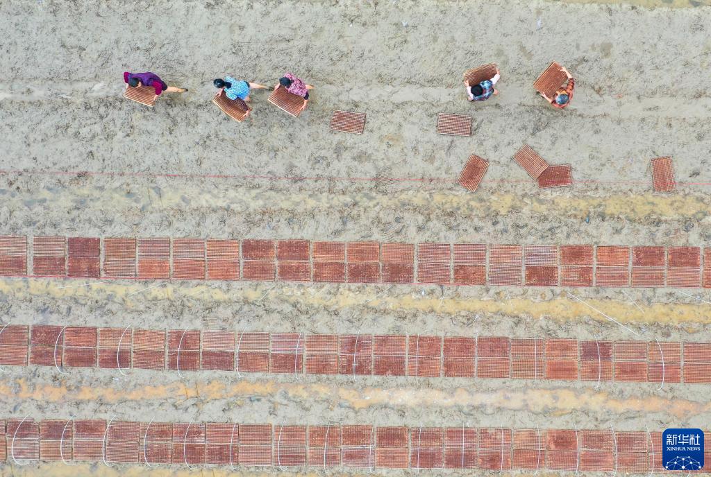 3月14日,在湖南省道縣營江街道曾家村,農(nóng)民在搬運(yùn)秧盤(無人機(jī)照片)。