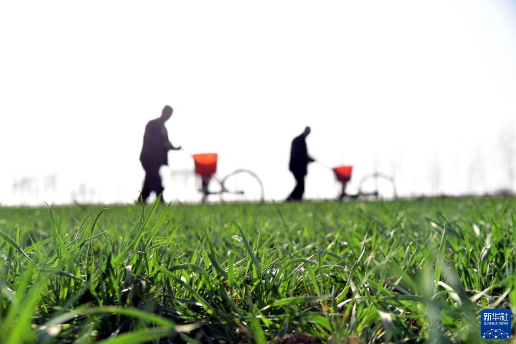 3月14日,在山東省聊城市茌平區(qū)胡屯鎮(zhèn),農(nóng)民給麥田追肥。