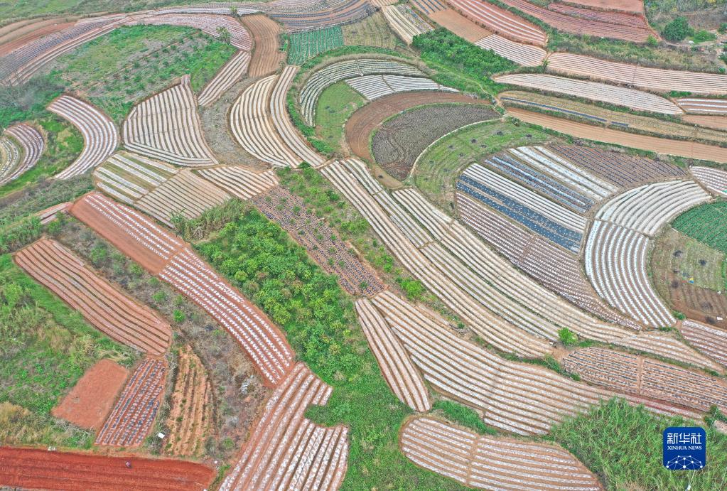 春回大地,廣西南寧市邕寧區(qū)蒲廟鎮(zhèn)縱橫交錯(cuò)的田地色彩斑斕,宛如色彩豐富的調(diào)色板(3月13日攝,無人機(jī)照片)。