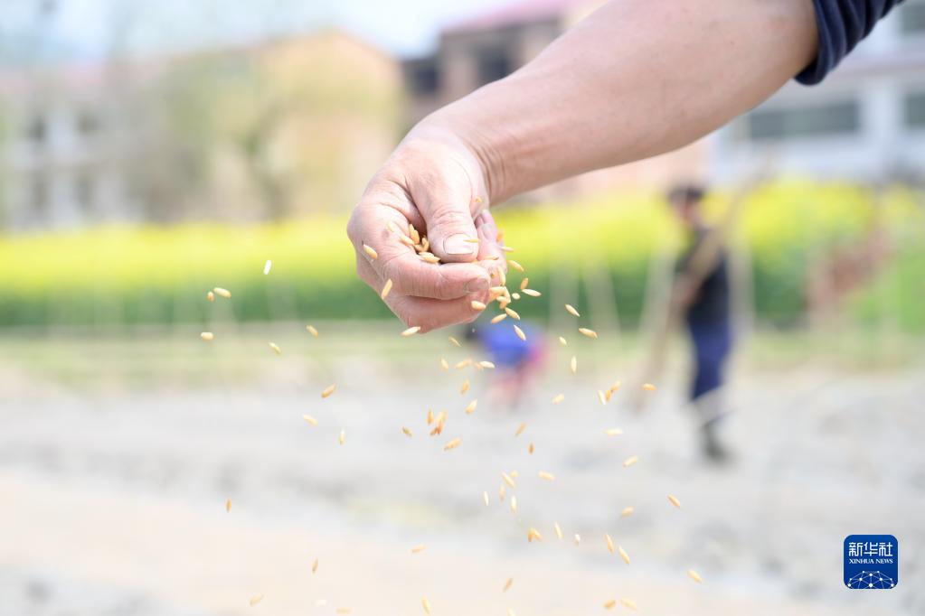 3月13日,在湖南省婁底市雙峰縣井字鎮(zhèn)花橋村,農民在田間播種。