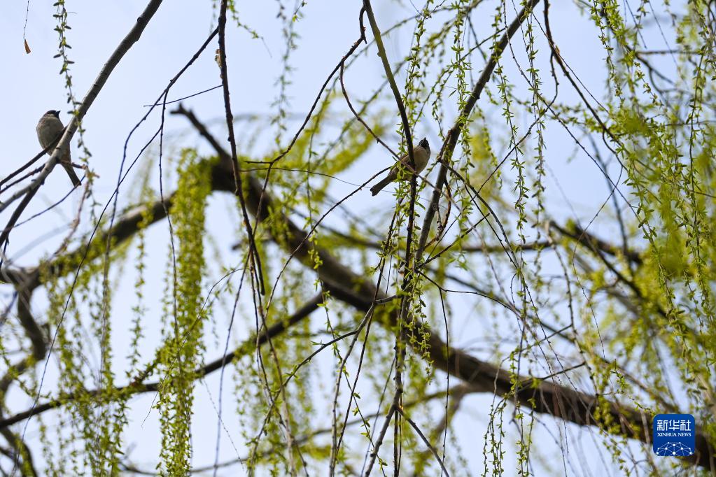 3月10日,在江蘇省昆山市旅游度假區(qū)錦溪古鎮(zhèn),兩只麻雀停留在柳樹上。