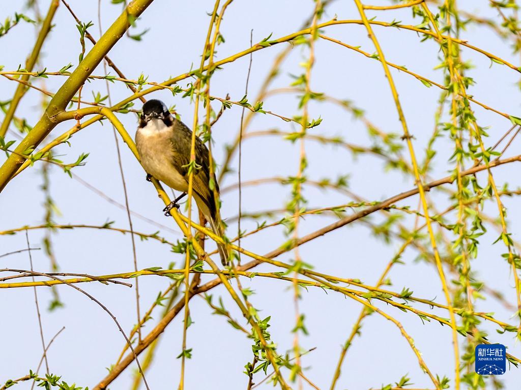 3月10日,在河南三門峽天鵝湖國家城市濕地公園,小鳥在樹枝上停留。