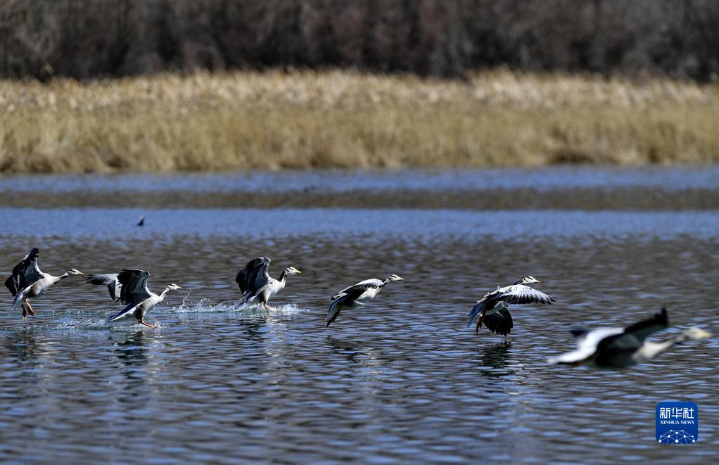 斑頭雁在拉魯濕地的水面上飛舞(3月20日攝)。