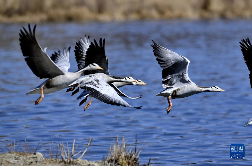 斑頭雁在拉魯濕地的水面上飛舞(3月20日攝)。