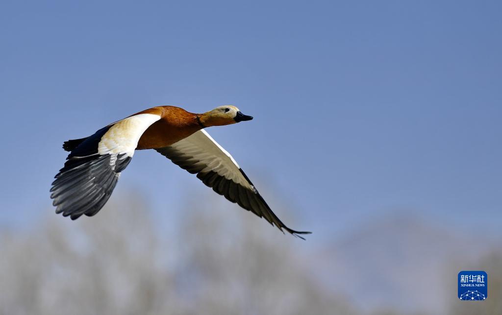 赤麻鴨在拉魯濕地上空飛翔(3月20日攝)。