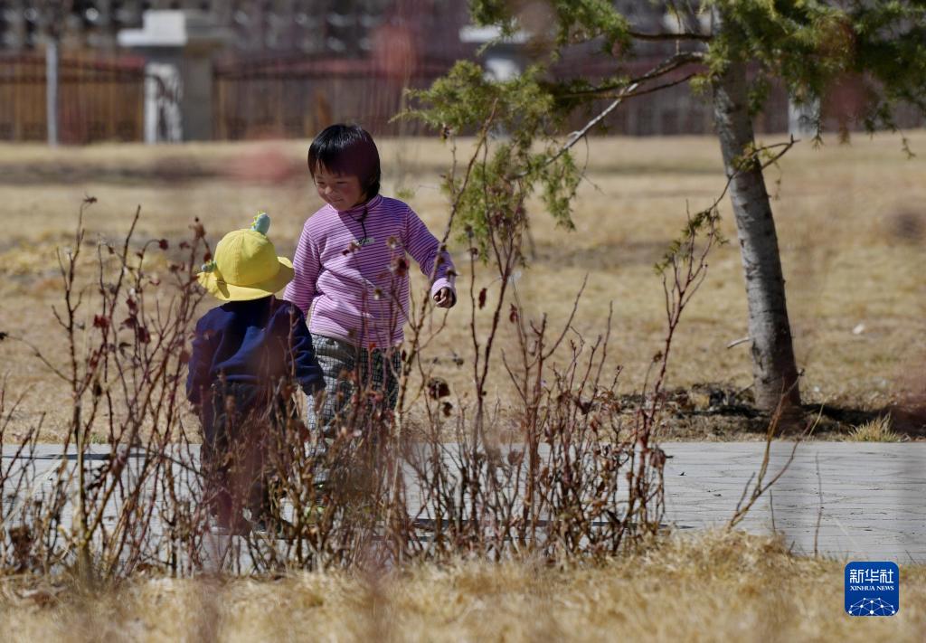 孩子們在拉魯濕地邊玩耍(3月20日攝)。
