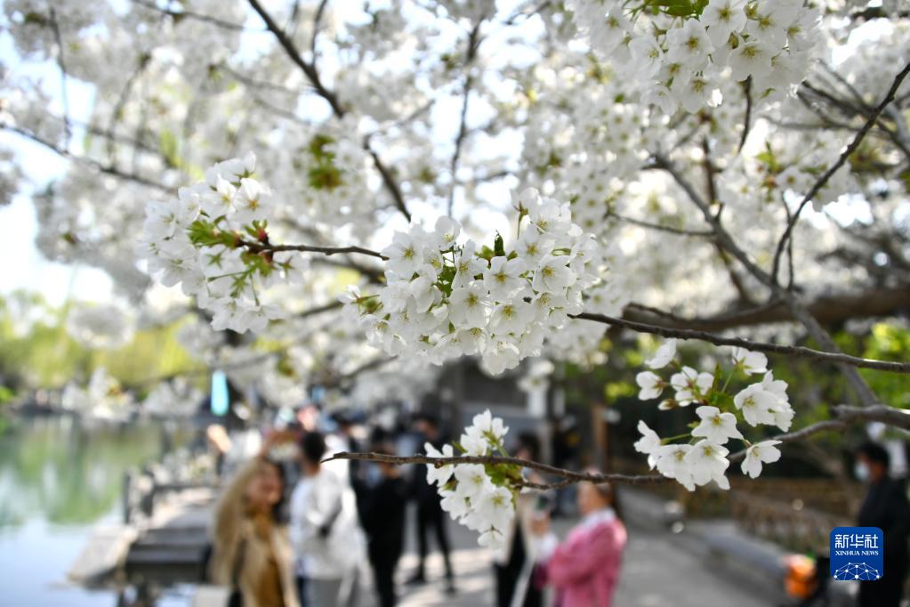 3月23日,在濟南市環(huán)城公園,人們在欣賞綻放的櫻花。