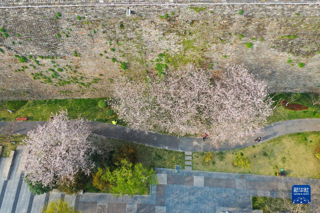 3月23日,游人在南京明城墻腳下游玩(無(wú)人機(jī)照片)。
