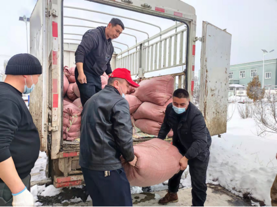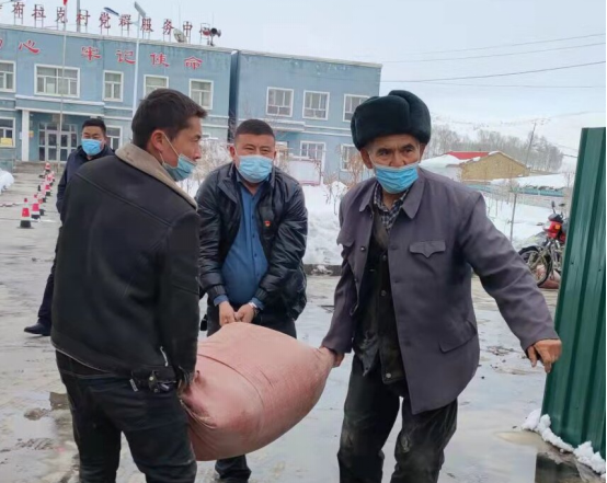3月25日下午,村委會院子內(nèi)前來領(lǐng)取飼料的牧民及相關(guān)工作人員正把一袋袋飼料裝上車。牧民們領(lǐng)取飼料,忙著裝車、拉運,臉上洋溢著燦爛的笑容,在寒冷的天氣里顯得格外溫暖。