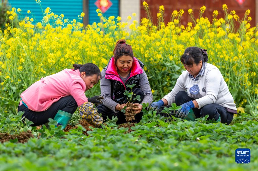3月30日,村民在貴州省黔西市杜鵑街道大興社區(qū)草莓基地進行種苗移栽。