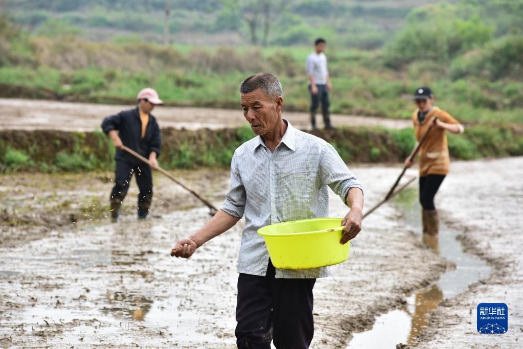 3月30日,湖南省郴州市嘉禾縣珠泉鎮(zhèn)茂林村,村民在田間撒播早稻種子。