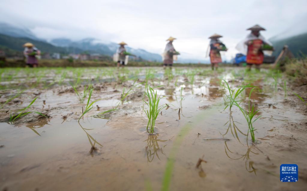 3月30日,在湖南省道縣四馬橋鎮(zhèn)社頭村,農(nóng)民在早稻田里拋秧。