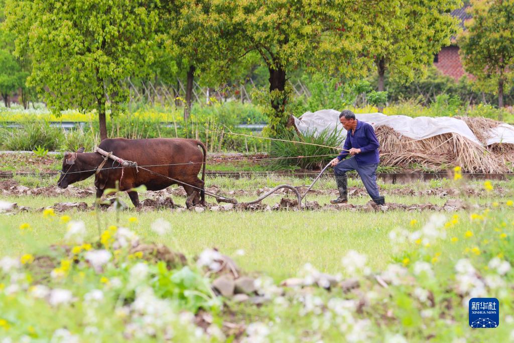 3月30日,在湖南省永州市新田縣驥村鎮(zhèn)黃公塘村,村民在田間用耕牛犁地。