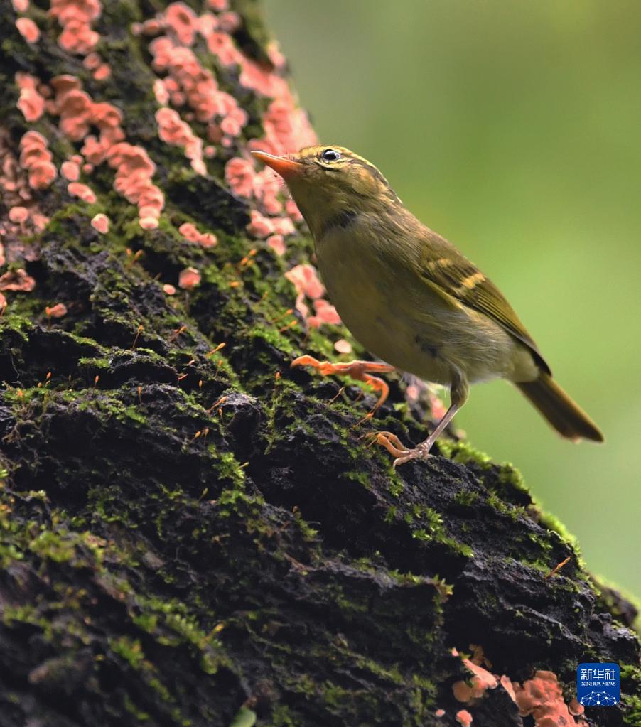 在福州金雞山公園,一只華南冠紋柳鶯在樹干上覓食(3月26日攝)。