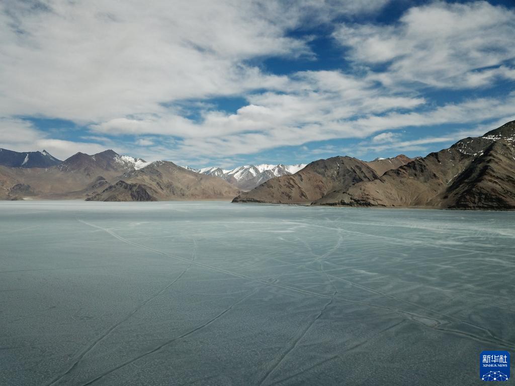 這是4月5日拍攝的班公湖冰面(無人機照片)。由于湖體狹長,部分湖面仍未解凍。