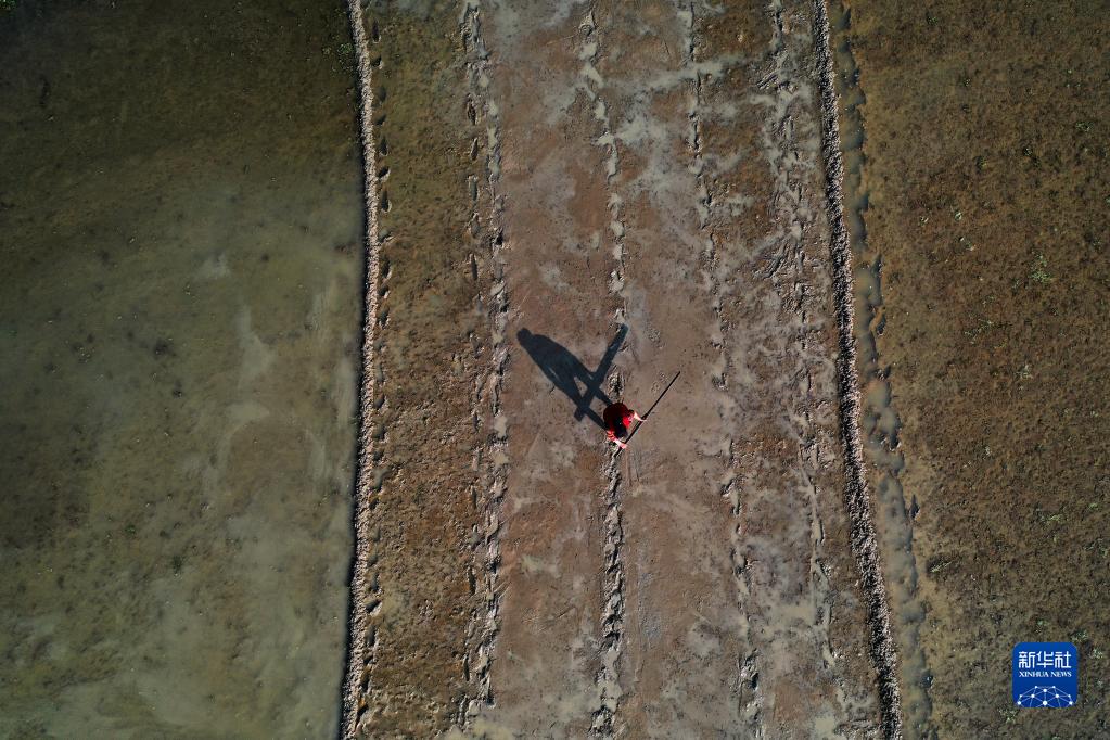 4月11日,在重慶市黔江區(qū)馬喇鎮(zhèn)蓮花社區(qū),村民整理準(zhǔn)備插秧的稻田(無人機照片)。