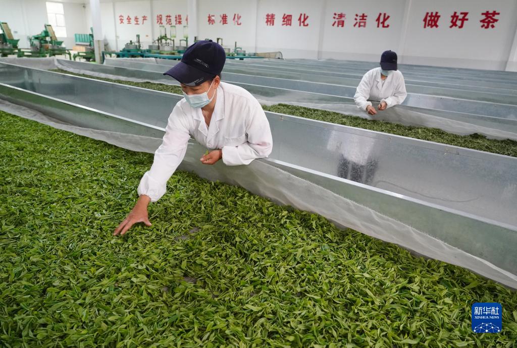4月12日,在安康市平利縣廣佛鎮(zhèn)一家茶企生產(chǎn)車間內(nèi),工作人員在進行萎凋作業(yè)。