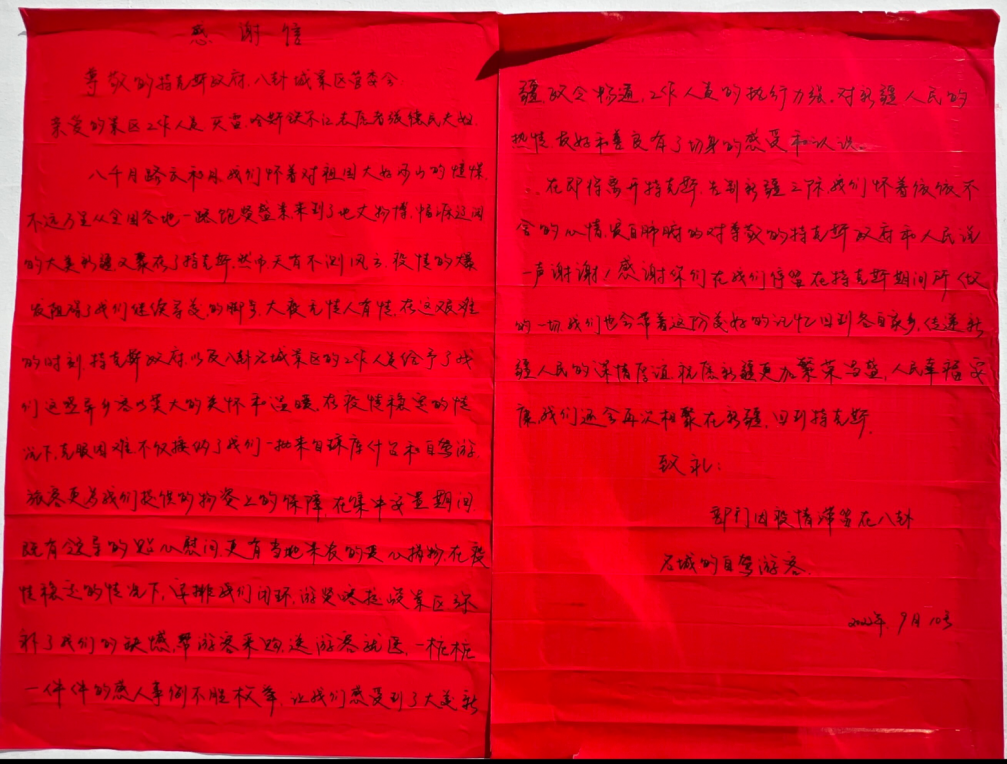 游客們想通過寫信方式表示感謝,安徽蕪湖游客陳軍代表全體游客寫了這一封感謝信。字里行間,情真意切,傾訴著游客們對特克斯縣各級領導、工作人員、志愿者以及八卦城這座城市的深深感激。
