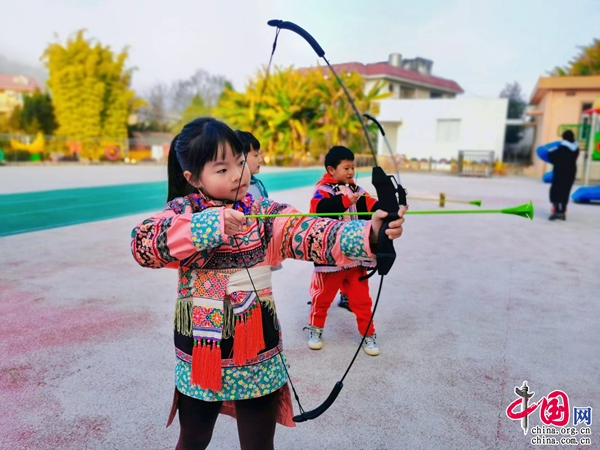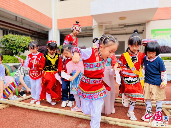 強化民族團結(jié)與傳統(tǒng)體育相融合。近年來,安寧市教育體育局始終堅持“以人為本”,本著從娃娃抓起的教育理念,常態(tài)化開展?jié)L鐵環(huán)、踩高蹺、打陀螺、踢毽子、竹竿舞等極具趣味性的民族傳統(tǒng)運動,將民族團結(jié)教育元素有機融入幼兒園教育教學(xué)、藝術(shù)和文化傳承活動中,形成了一班一運動、一班一特色的民族團結(jié)進步教育體系,把民族團結(jié)教育融入到孩子們?nèi)粘I睢W(xué)習(xí)中,促進民族團結(jié)的種子在孩子們心里生根發(fā)芽。