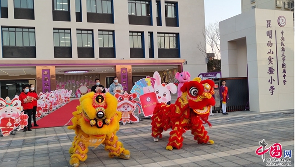 (2月13日上午,中央民大附中昆明西山實驗小學(xué)全體師生齊聚校園舉行了一場主題鮮明、獨具特色的開學(xué)儀式。在校園吉祥物“和和”“美美”的簇?fù)硐?,老師們手持裝有和和美美、學(xué)習(xí)進步、體藝科技、勞動實踐、民族同心及心愿貼等“校長禮物”紅包,遞給每一位入校的同學(xué),送上新學(xué)期的祝福和期望。)