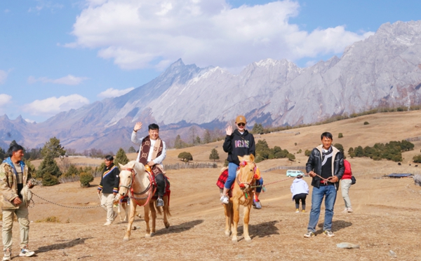 “住在這里,坐看云卷云舒,臥看璀璨繁星,觸目所及就是層巒疊嶂的美景,騎馬上山,哈巴雪山與玉龍雪山遙相呼應(yīng),還可以鳥瞰金沙江,太令人震撼了!”從山東青島遠(yuǎn)道而來的張雷騎著馬感受著美景,并不時(shí)拍照留念。(魯茸追瑪 吳姍蕙 楊小楠 香格里拉市委宣傳部供稿)