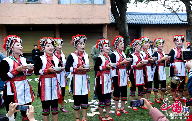 上午十點半左右,村民在通往祭火臺的道上鋪墊松針,擺上彝家美食,同游客席地而坐,唱起歡快的阿細酒歌,共享彝家菜肴的美味。