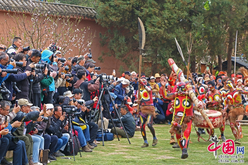 下午一點半左右,在游客們的翹首以盼中,祭火隊伍聲勢浩大地向祭火臺跳來。青年男子手拿刀叉,敲鑼打鼓,抬著他們的火神“木鄧”向取火臺靠近。龍樹下,在畢摩的主持下,村民用古老的鉆木取火方式點燃新的火種。