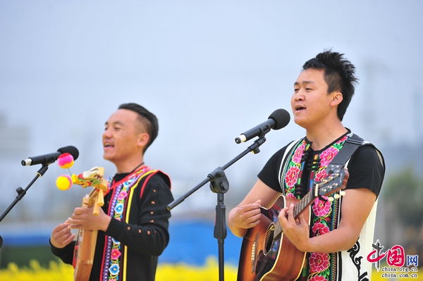 春日花海,躍動(dòng)田間?;顒?dòng)在彝族民間歌舞“阿卡舞”飛旋的舞步里拉開序幕。羊皮翻歌、彝族歌曲、《花海彝秀》表演等獨(dú)具彝族特色的節(jié)目將開幕式現(xiàn)場(chǎng)氛圍推向高潮。游客漫步金黃花海之間,任憑陣陣清風(fēng)拂過臉頰,吮吸花香,忘卻煩憂,享受片刻悠閑。賞花、拍照、錄視頻、聽演唱、看表演、品美食,玩得不亦樂乎。
