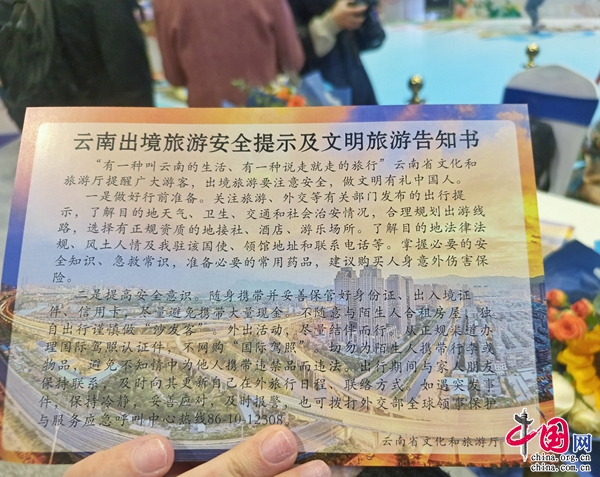 現(xiàn)場(chǎng)還為游客發(fā)放了云南出境旅游安全提示及文明旅游告知書,提醒游客做好行前準(zhǔn)備、提高安全意識(shí)、謹(jǐn)慎選擇高風(fēng)險(xiǎn)項(xiàng)目、理性消費(fèi)、文明有禮出游。