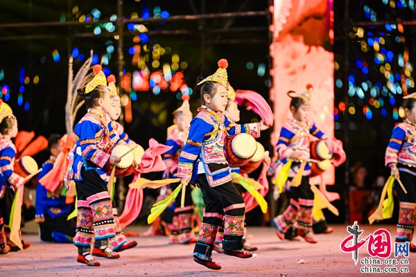 文藝演出在民俗表演《虎之源》中拉開序幕,整臺演出由《鼓舞虎鄉(xiāng)》《踏歌哀牢》《綠色家園》三個篇章和尾聲歌伴舞《幸福中國一起走》組成。畢摩搖響手中的法鈴、敲響祈福的鑼笙,虔誠的祭祀虎神。流傳久遠(yuǎn)的老虎笙、大鑼笙、小豹子笙表演,展示著彝族古儺儀的“珍存”。