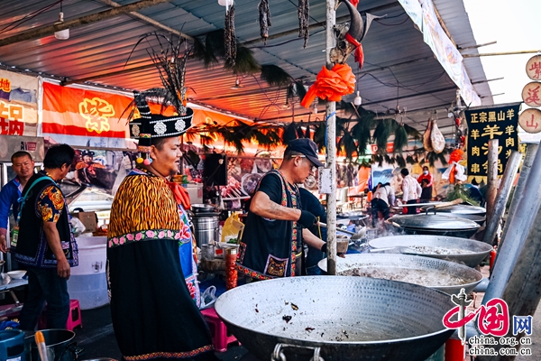 在“多彩雙柏”商品交流貿(mào)易活動暨地方美食羊湯鍋一條街上,“白竹山茶”“雙柏妥甸醬油”、彝族刺繡文創(chuàng)產(chǎn)品等名特優(yōu)產(chǎn)品琳瑯滿目,吸引著廣大游客爭相前來購買。最受歡迎的,莫過于這里的“彝族風(fēng)味羊湯鍋”了。數(shù)十口大鐵鍋依街而擺,蔚為壯觀,鍋里翻騰著肥嫩的黑山羊肉,滿街彌漫著誘人的香味。凡走進(jìn)美食街的游客,幾乎都無一例外地邀約朋友或家人一起,向店家點(diǎn)上一桌以“羊湯鍋”為主菜的彝家美味佳肴,在鋪滿松毛的地上臨席而坐,感受節(jié)日的氛圍,分享人生的快意。