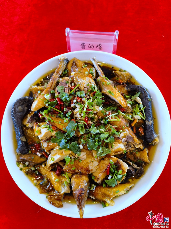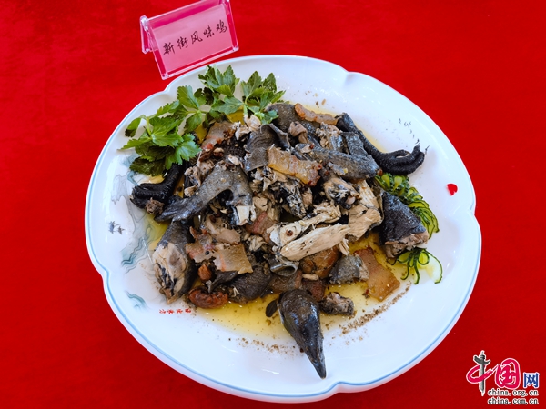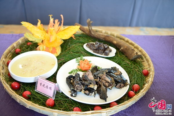 把殺好的土雞整雞燉熟后切塊,鍋中放入少許新街彝家風味臘肉和草果炒香,再加入切好的雞塊翻炒,裝盤即可;此道菜肴口感細嫩,風味獨特,營養(yǎng)豐富。