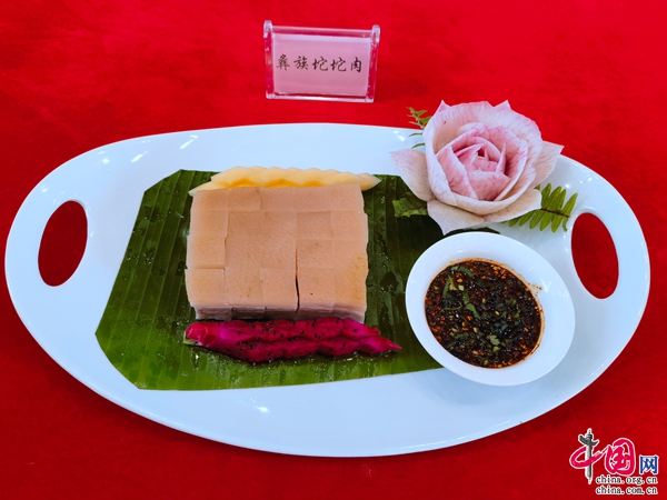 選用香豬五花肉的精華部分,配上妥甸醬油和辣椒粉,可煮可蒸,是彝族人家一道具有代表性的菜品,造型似坨狀,肥而不膩。(李應(yīng)春 李連濤)