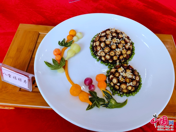 主要選取優(yōu)質(zhì)紅棗、蓮子、桂花糕,搭配五谷雜糧(薏仁、小米、紫米、青豆、葡萄干)制作而成。將紅棗一分為二去籽成空心狀,蓮子浸泡后去芯,將蓮子塞進紅棗中,扣入兩個大小不一的模具,將提前蒸好的五谷雜糧均勻填入模具中,進蒸籠蒸熟扣入餐具中,做成葫蘆形狀,用挖球器挖出胡蘿卜,青筍小球形做成葫蘆,冬瓜皮做成葫蘆葉擺盤做出點綴,青豆米燙熟后圍邊點綴,最后淋上提前準備好的桂花汁。