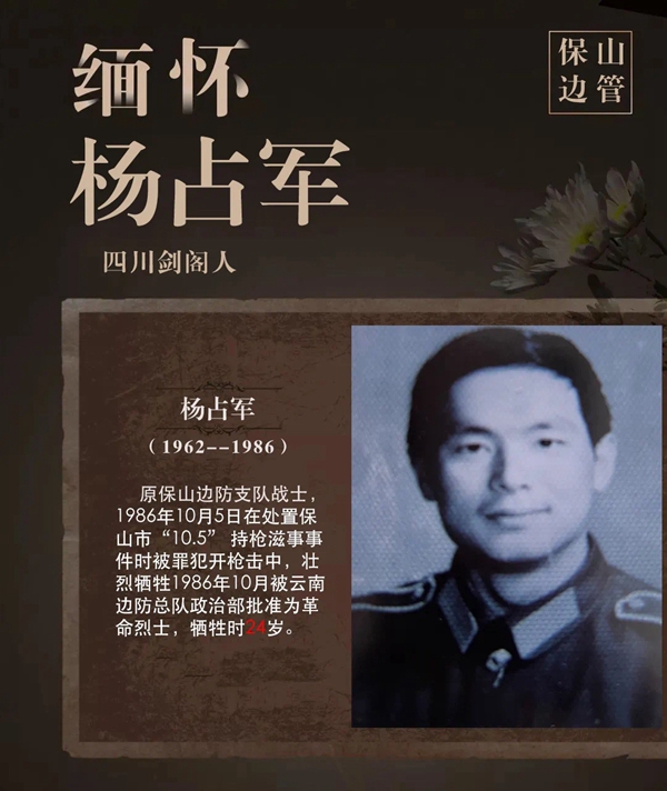 烈士楊占軍,1980年11月入伍,1985年7月入黨,1986年在邊境一線執(zhí)行任務時,被罪犯開槍擊中,壯烈犧牲,年僅24歲。
