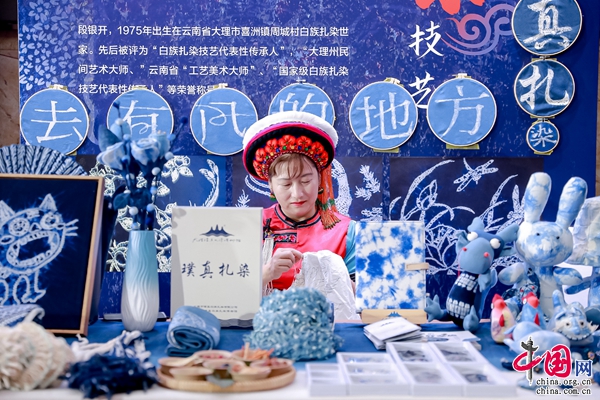 電視劇《去有風(fēng)的地方》熱播以來,大理成為許多人心之向往的旅游目的地。這一次,國家級白族扎染技藝代表性傳承人段銀開把電視劇同款的扎染制品帶到了推介會?!霸竟欧Q‘絞纈’,是中國一種古老的紡織品染色技藝。扎染一般以棉白布或棉麻混紡白布為原料,以植物藍靛為染料。”段銀開一邊展示,一邊介紹,“很高興能把扎染工藝品帶到廣州來,讓更多人看到藍白之間的精美藝術(shù)?!?/p>