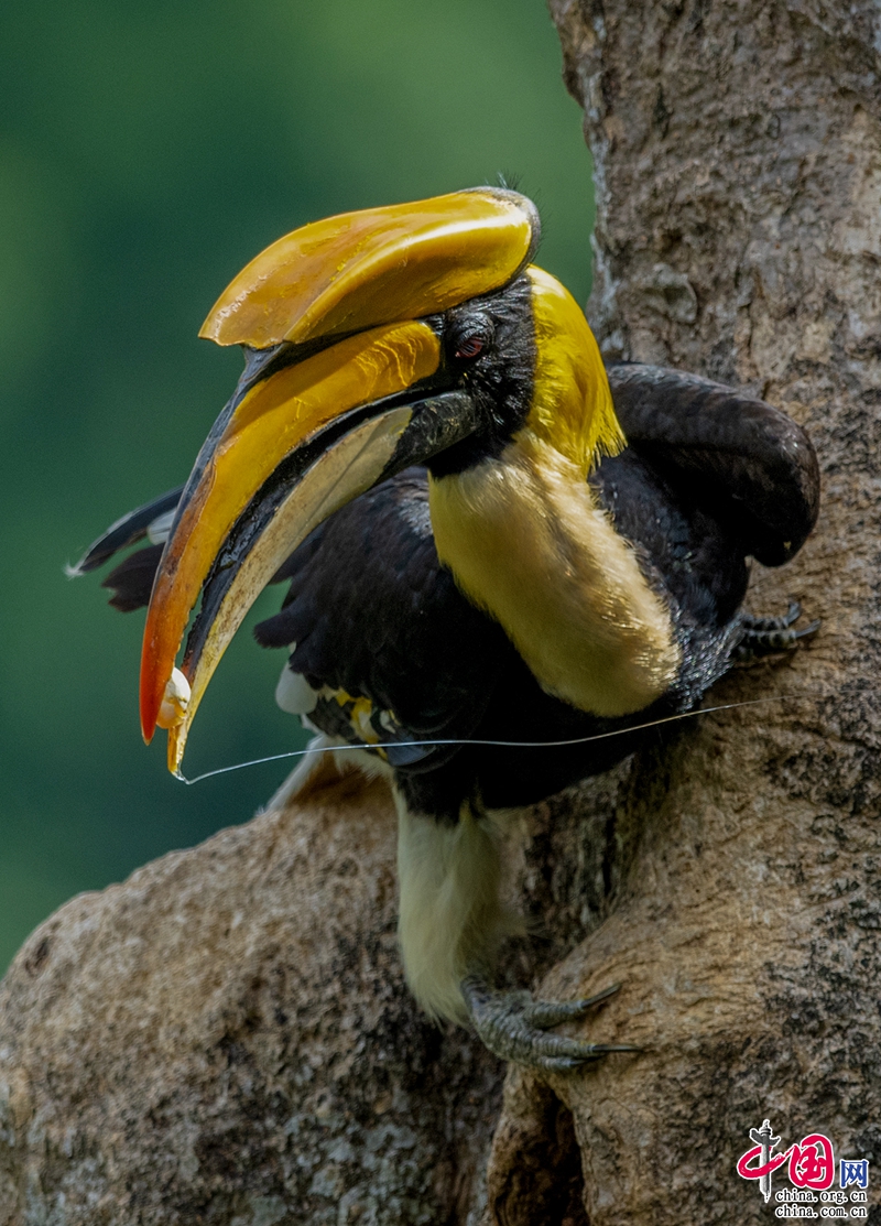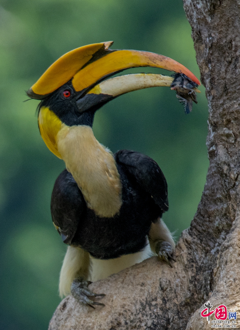 在很多人的認知里,鳥類通常以果子為食,犀鳥也不例外。但經(jīng)過國內(nèi)外攝影師多年來的觀測、拍攝,今天要告訴大家“犀鳥可不是吃素的”。在絕大多數(shù)的時間里,犀鳥主要以榕樹果等果子為食,但是在每年育雛期間,成年犀鳥會捕獵其它鳥類或者爬行類動物、昆蟲等給犀鳥寶寶增加營養(yǎng)。特別是在犀鳥寶寶要出巢之前,犀鳥父母幾乎每天都會給小寶寶“加葷菜”。