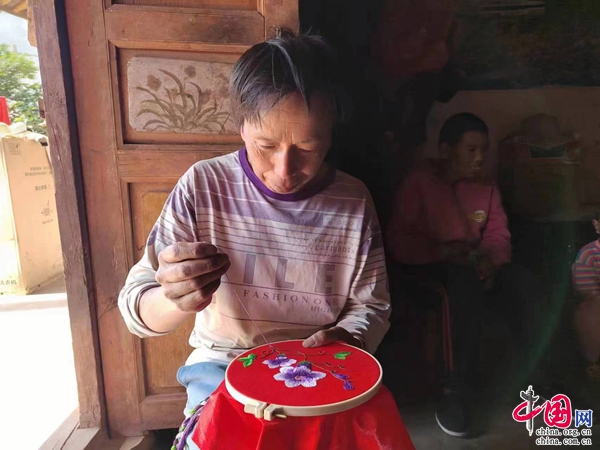 羊街鎮(zhèn)是一個漢、彝、苗、傈僳、回等多個民族聚居的鄉(xiāng)鎮(zhèn),彝繡在羊街已有上百年歷史,成為當(dāng)?shù)厝藗鞒邪倌甏┰谏砩系摹皻v史符號”。羊街鎮(zhèn)有彝繡國家級非遺傳承項目1個,州級非遺傳承人4個,縣級非遺傳承人16個。受邀前來為這場為脫貧人口舉辦的培訓(xùn)班“講師”,便是羊街鎮(zhèn)州級非遺傳承人劉建英。劉建英從小便在家人的耳濡目染下接觸彝繡,16年來,她堅持傳承民族刺繡文化,在傳統(tǒng)刺繡針法的基礎(chǔ)上,加入了平針、沙針、打籽針、輪廓繡等,并與挑、壓、鑲等工藝相結(jié)合,目前繡品種類已達(dá)20余種。