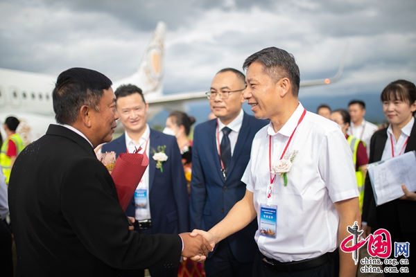 (德宏州委副書記、州長衛(wèi)崗在機(jī)場迎接緬甸航空領(lǐng)導(dǎo),楊立/攝)