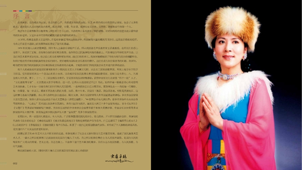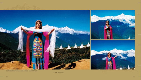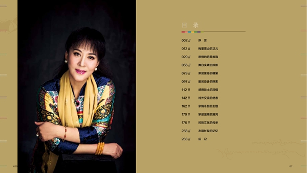 畫冊用《梅里雪山的清純女兒》《恩師的培養(yǎng)教誨》《圣潔山谷的天籟迴聲》《感恩故土一往情深》《傳承民族文化的使命》《對外文化交流的友好使者》《參會議政履行職責(zé)》《舞臺藝術(shù)的回顧》八個單元的圖片組合,真實(shí)的記錄和再現(xiàn)了宗庸卓瑪從事歌唱藝術(shù)至今45年的足跡,形象地展示了社會主義新時期文化藝術(shù)繁榮發(fā)展造就了民族優(yōu)秀藝術(shù)人才的茁壯成長。
