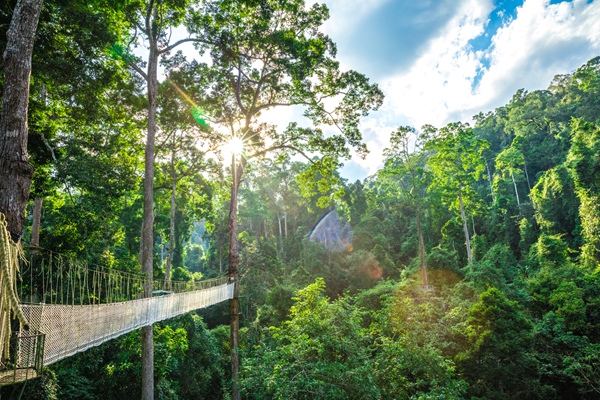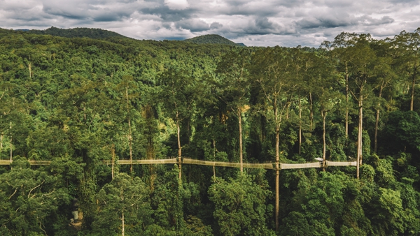 登上木梯,闖入?yún)擦?,就到達了景區(qū)中最負盛名的景點——樹冠走廊。在其中行走,置于雨林之中,體會別一番的“望岳”,同古人隔空對望,感受雨林式的“一覽眾山小”。麻繩和鋼索將這些蒼翠巨人鎖在一起,構(gòu)成了36米高的空中走廊。只需登上走廊,茂密如蓋的“綠色”盛宴盡收眼底。在走廊中漫步,夏天的尾巴透過森林之上的冠部鋪滿叢林,感受一番南國森林帶來的秋天的暖意。(何慧/文 西雙版納州文化和旅游局/圖)